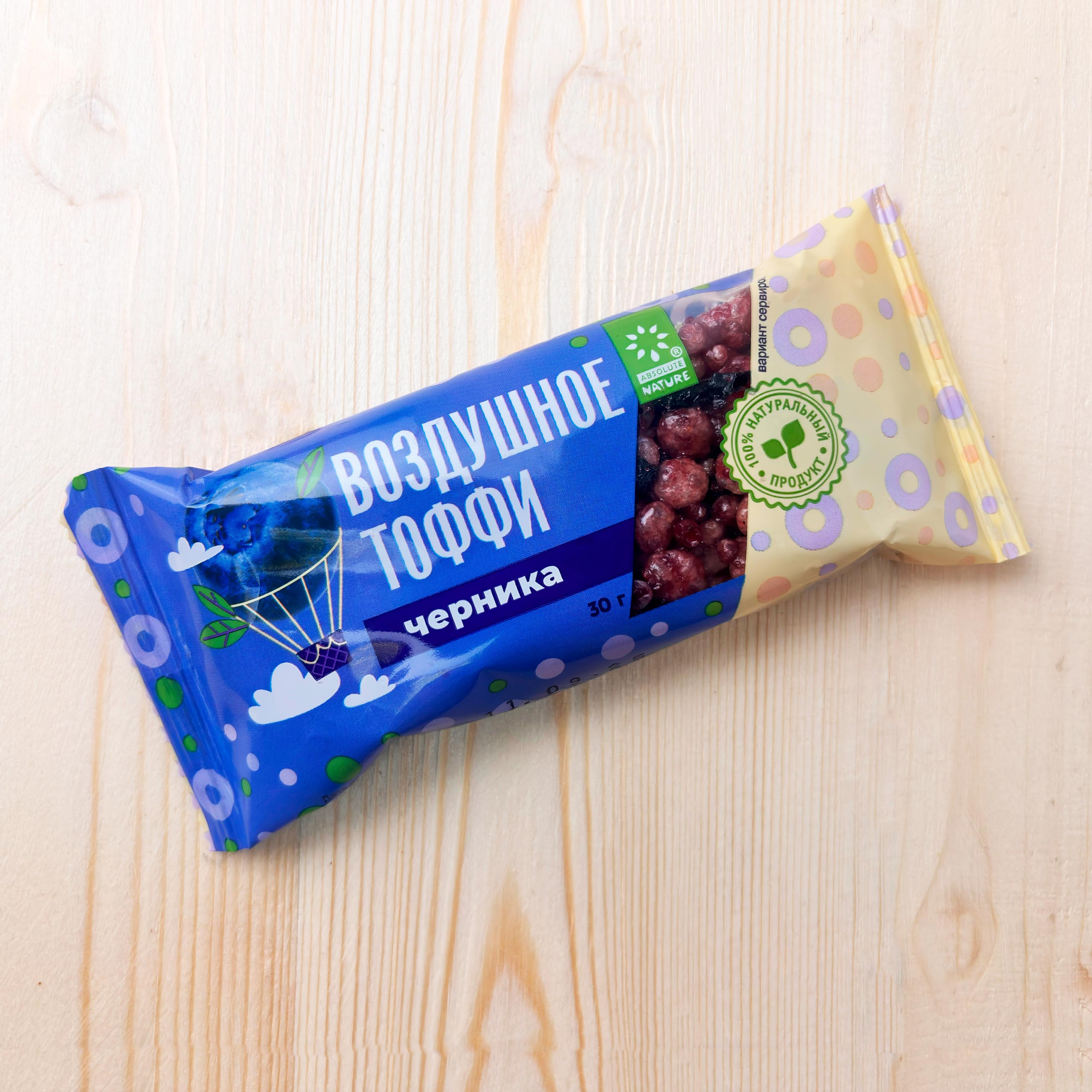 Воздушное Тоффи – лёгкий десерт в удобном формате батончика, изготовленный из воздушных многозлаковых шариков и цельного сгущенного молока – Тоффи, с добавлением натурального какао, арахиса и ягод черники.